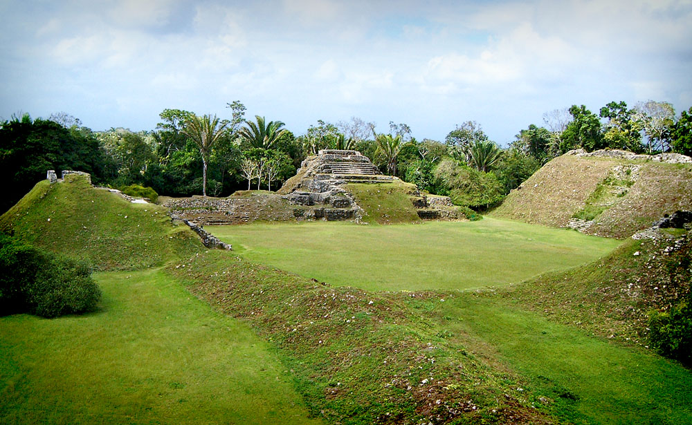 W0767: Plaza A Construction started on Plaza A in about 250AD and it eventually replaced the first ceremonial centre which lies further west. The Maya of Altun Ha practised the archetypal Mesoamerican principle of building their ceremonial structures around large square plazas.In total they built 8 structures around Plaza A, with an approximate north-south alignment. Figure W0767 looks west from Structure B-1, which is not much more than a mound and runs into a similar mound called Structure A-4. Structure A-4 sits in the west corner of the southern flank and was a simple platform possibly designed to close Plaza A off from Plaza B. The larger structure that A-4 leads into along the southern flank is a temple known as Structure A-3 (you can see the side of Structure A-3 in figure W0767 above).