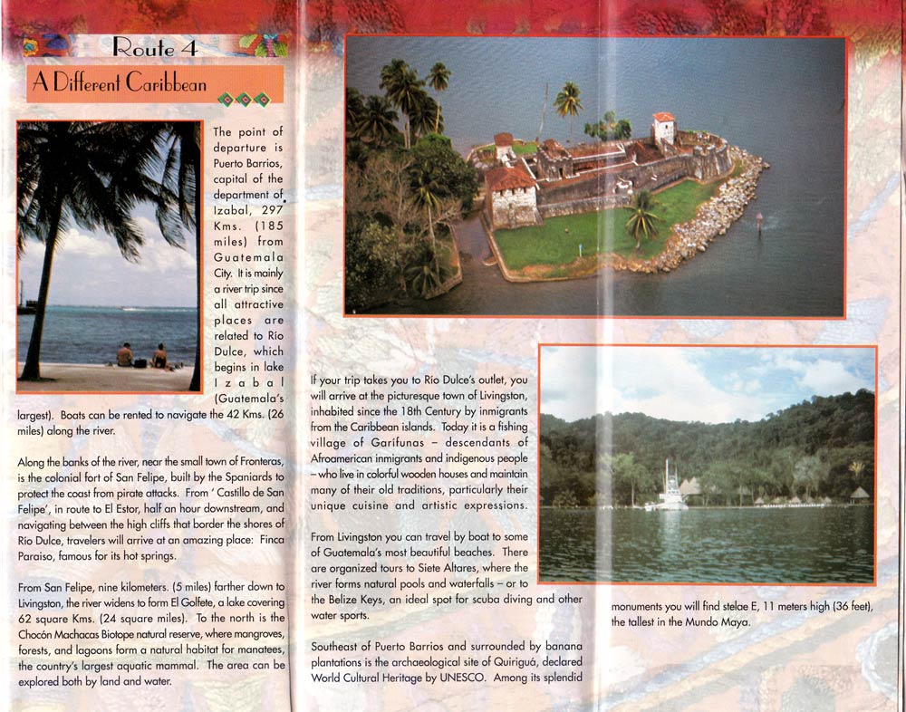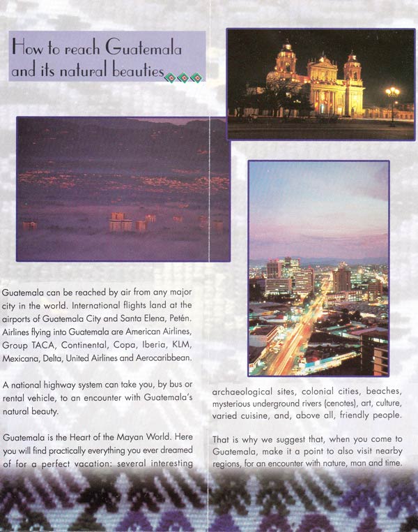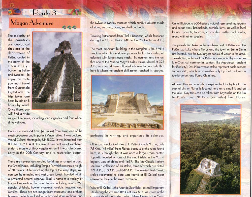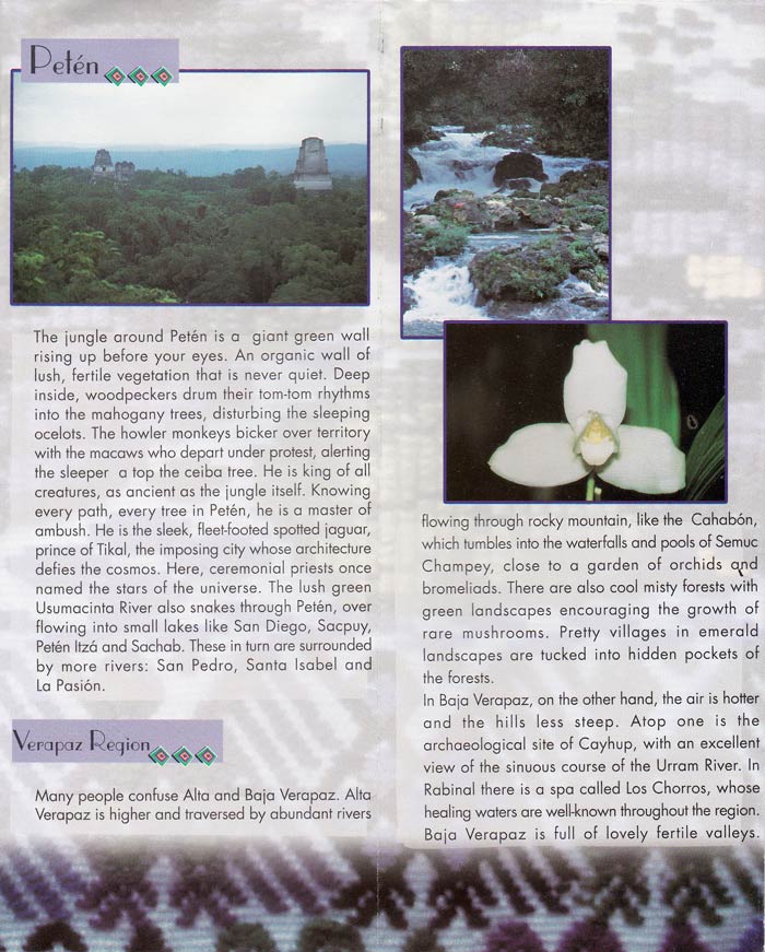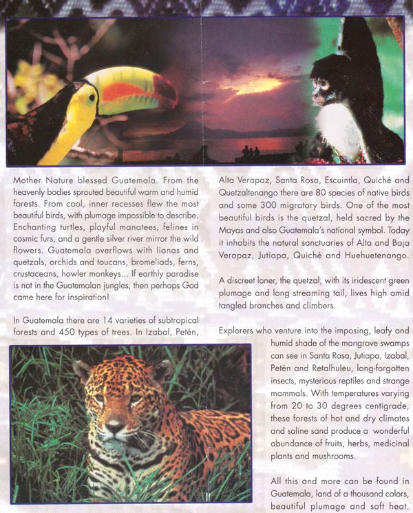 This is a collection of tourist pamphlets collected in early 2002. Some of the highlight are in the “Getting There” section, feeling it necessary to tell us we can fly there from any major city. The opening paragraph of the “Nature – Introduction” is an incredible piece of creative writing. The opening paragraph to the “Nature – Lake Atitlan” makes no sense at all and the “Nature – Peten” section is equally strangely written. I could go on, but suffice it to say, for a national tourist campaign the pamphlets really highlight how little expenditure they had.