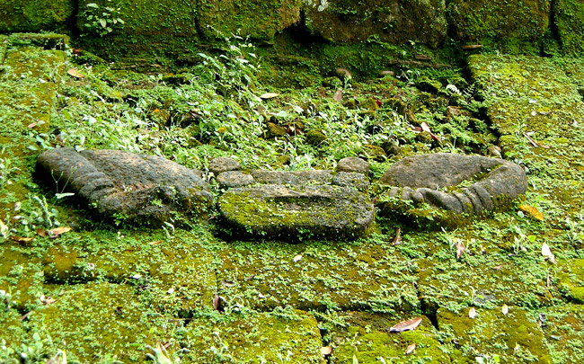 This unusual motif is found on the left hand side of the stairs leading up from the acropolis plaza to building 1B-1. It is uncertain what the motif is of, but it looks like an toad-like head with human arms. It may have been a coat-of-arms for one of the rulers of Quirigua (click here to read about The Acropolis).