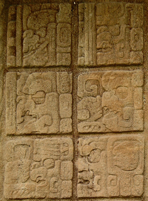 These are the date glyphs from the side of Stela A. The monstrous faces are the period of time and start with B’aktun in the top left, then K’atun in the top right, then tun is second down on the left, followed by winals second down on the right…and so on. You can see the dot (equalling one) and bar (equalling five) number system in the first three glyphs – the first equals 9, the second equals 19, the third 5, then the rest equal zero. So we have 9.17.5.0.0, which equates to 27th December 775AD.