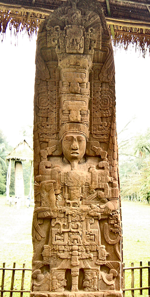 Stela D dates to 9.16.15.0.0, which equates to the 17 February, 766AD. To find out more about the imagery, please read the article The Stelae of Quirigua. This Stela is also discussed in the speculative article entitled Is This the Face of the Pharoah of Quirigua?