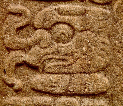 Quiriguá June 19, 2014 400 × 346 Quiriguá Stela J – Left Side Glyph A glyph found on the left side of Stela J at Quirgua. © Robin Heyworth – Photo taken 3rd February 2002
