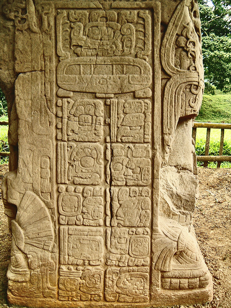 This is a close up of the glyphs on the right side of Stela K at Quirigua. Ancient Alien theorists would almost certainly take an interest in the motif at the top! However, this flying saucer is the Mayan emblem that precedes a date and this is the glyphic text that provides the date for the monument. The glyphs are read from left to right, starting from the top, with the pictures denoting the period of time (years, months, days, etc), and the dots (equalling 1 each) and vertical bars (equalling 5 each) providing the quantity of those periods. For example the top left is 9 B’ak’tun – approximately 3546 years, as each baktun roughly equals 394 years. This is followed by 18 Katuns – about 360 days, and so on. The full text (click here to view) provides a date of 9.18.15.0.0 3 Ahau 3 Yax, which equates to the 22nd July 805.