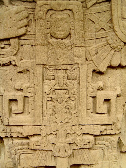 This is a close up of the other side of Stela K at Quirigua. Like the main image seen in W0985 in the main article this side of the Stela also features a God’s face within the trunk of a tree.