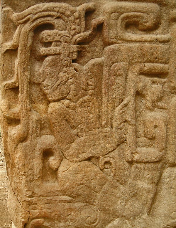 This is the image of the Corn God from the back of Stela H. He is easily identifiable by the Corn plant that emanates from his head, like hair. Find out more in the article The Stelae of Quirigua.