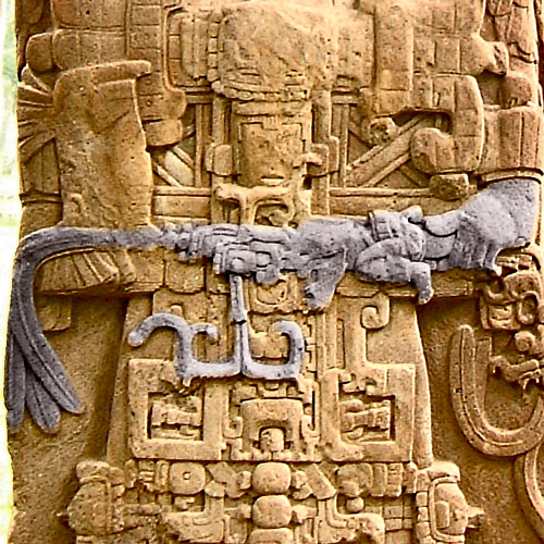 The Stelae of Quirigua June 24, 2014 500 × 500 The Stelae of Quirigua Stela D – Sceptre In this close up you can see the sceptre held by Cauac Sky on Stela D. © Robin Heyworth – Photo taken 3rd February 2002