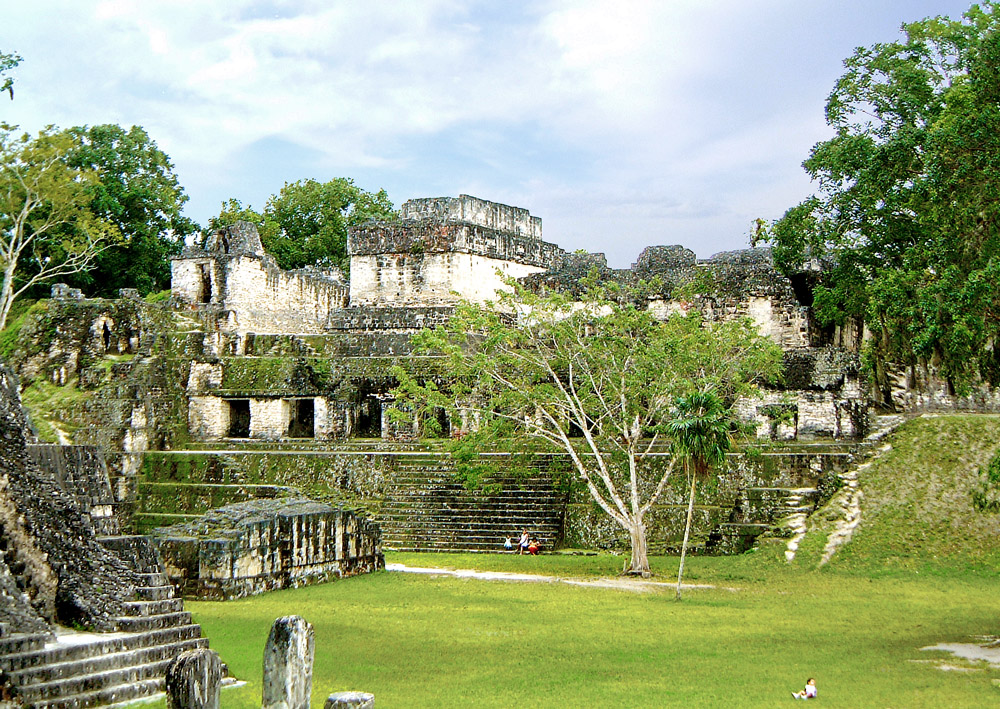 This is the view from the Northern Acropolis across the main plaza to the Central Acropolis. The foot of Templo I is just visible in the bottom left corner and beyond that is the western wall of the ballcourt. The imposing structure on the far side of the plaza is Structure 62, which lines the northern side of the Central Acropolis.