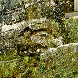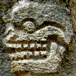 Fig. W0425S:  Chichen Itza To add to the mystery, three stucco skulls were added to the small platform on which the niche sits. One skull looks right from the right-hand corner, another looks left from the left-hand corner, and the third looks straight ahead from the centre of the platform, directly beneath the entrance to the niche. The skulls are very similar to those found at on the Tzompantli (skull rack), which is also known as the Platform of Skulls, at Chichen Itza. As you can see from fig. W0830S, which is the skull from Structure 5D-87 at Tikal, and fig. 0425S, which is one of the skulls on the Tzompantli  at Chichen Itza, they both share the distinctive groove running around the eye and along the cranium. There is no knowledge of contact between the two cities and they couldn’t be much farther apart in style, distance and epoch, however, it would be highly improbable that the both came cities came to this design independently of one-another.