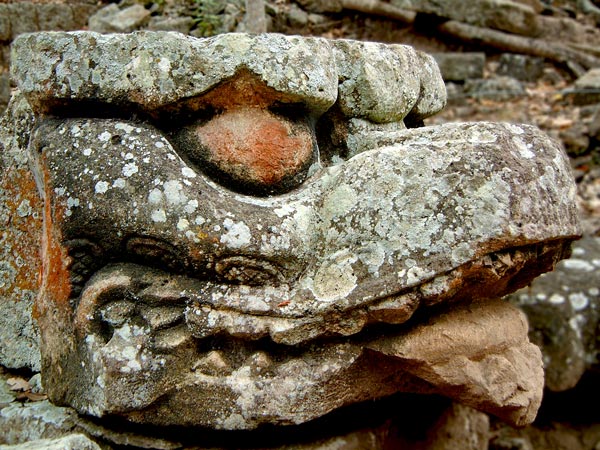 This is a fairly typical building ornament from Copan and depicts a serpents head with it tongue hanging out. It is located in front of Temple 11 at the northern end of the West Plaza, and is thought to have been part of an enormous frieze that was ripped down after the kings death (click here to read more…)