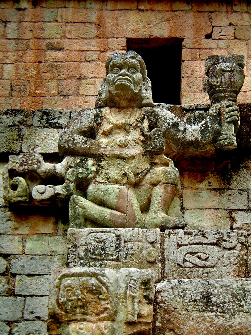 This character is known as the Howler Monkey God and is one of a pair mounted on the South Side of Templo 11 looking into the West Court. He is part of a narrative about the Underworld which is built into the fabric of Temple 11 (click here to read more).
