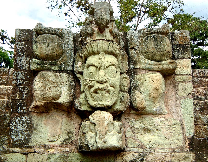 Copán July 17, 2014 800 × 625 Copán Deity on Jaguar Staircase This carved head is found on the Jaguar Stairway in the East Court. He is thought to represent the Sun Deity, Kinichi Ahau, surrounded by representations of Venus. © Robin Heyworth – Photo taken 9th February 2002