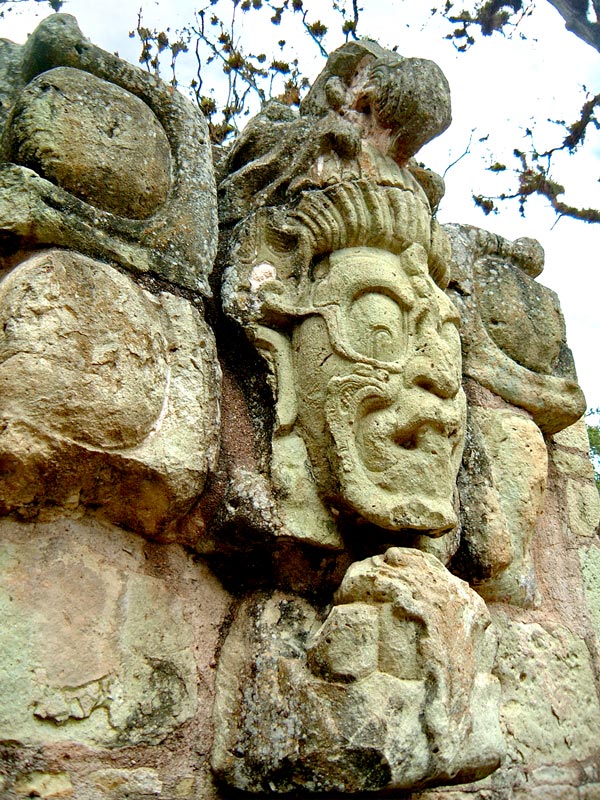 Copán July 17, 2014 600 × 800 Copán Deity on Jaguar Staircase This carved head is found on the Jaguar Stairway in the East Court. He is thought to represent the Sun Deity, Kinichi Ahau, surrounded by representations of Venus. © Robin Heyworth – Photo taken 9th February 2002