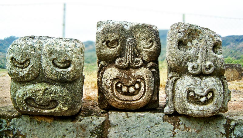 These funny faces demonstrate the humorous side of Mayan art. A smile is seldom seen, so there is something very unique about the pieces. They are found amongst a jumble of carved stones that were presumably recovered from the collapsed buildings to the north of the East Plaza that were swept away by the river. It is worth noting that carving was a religious activity that any nobleman may take part in and for those less able for the art of war or the ritual ball-game, it was a way of contributing to the religious efforts of the city. Therefore, the artwork was not always consigned by the Royal family or High Priest, and many pieces of work found at Copan were undertaken as a past-time.