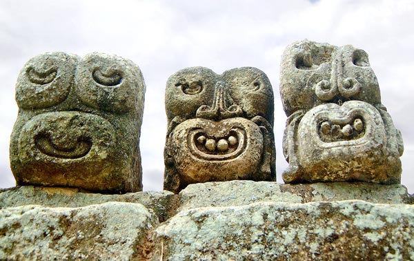 These funny faces demonstrate the humorous side of Mayan art. A smile is seldom seen, so there is something very unique about the pieces. They are found amongst a jumble of carved stones that were presumably recovered from the collapsed buildings to the north of the East Plaza that were swept away by the river. It is worth noting that carving was a religious activity that any nobleman may take part in and for those less able for the art of war or the ritual ball-game, it was a way of contributing to the religious efforts of the city. Therefore, the artwork was not always consigned by the Royal family or High Priest, and many pieces of work found at Copan were undertaken as a past-time.