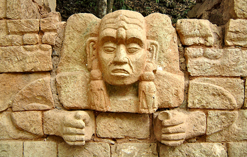Structure 29 lies in the “Cementario” area, just south of the Main Acropolis. It is thought to be a sleeping house and is adorned with many unknown motifs – this head is one of two heads whose meaning is unknown. He appears to have been clutching something once upon a time.