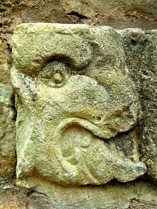 This carved stone is part of the brickwork of Structure 11, the Temple of Inscriptions, at Copan. It demonstrates the depth of artistic style and breadth of the subject matter, as this animal figure is the only example at Copan. It is thought that even the Royal family learned skills such as painting and carving, and so many original and unique pieces were created for fun as much as for function.