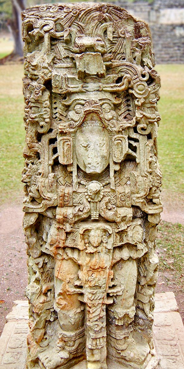 Stela N was erected by K’ak’ Yipyaj Chan K’awiil (otherwise known as Smoke Shell) in the year 761AD. It sits at the foot of the stairs of Structure 11, which is also known as the Temple of Inscriptions, under which it is thought lies the body of Smoke Shell, the 15th ruler of Copan (click here to read about the stelae of Copan).