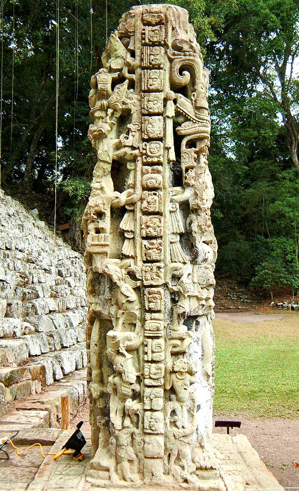 Stela N was erected by K’ak’ Yipyaj Chan K’awiil (otherwise known as Smoke Shell) in the year 761AD. It sits at the foot of the stairs of Structure 11, which is also known as the Temple of Inscriptions, under which it is thought lies the body of Smoke Shell, the 15th ruler of Copan.