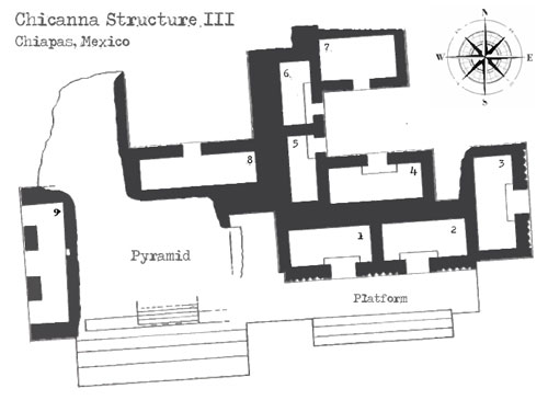 Chicanna Structure III July 13, 2016 500 × 365 Chicanna Structure III X0662-3: Structure III Floor Plan The floor plan of Chicanna Structure III show how most of the rooms were hidden around the small pyramid structure.