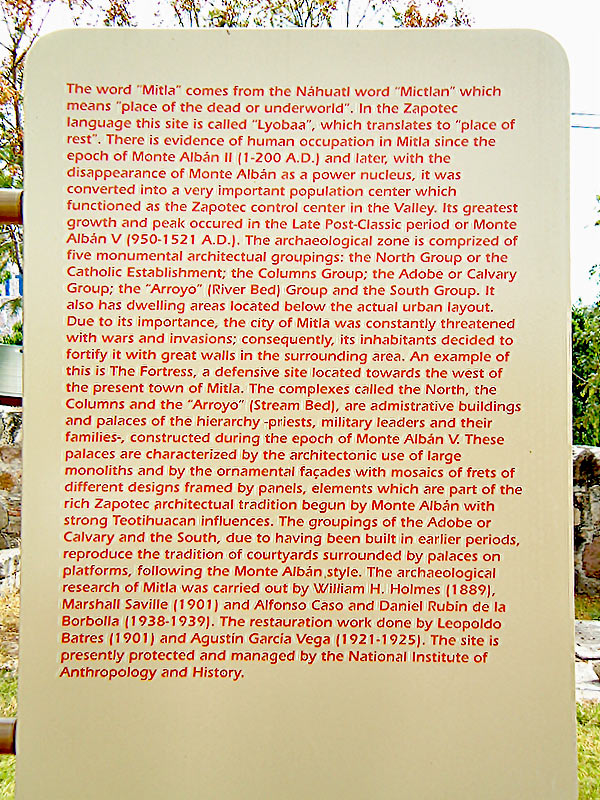 Mitla April 17, 2014 600 × 800 Mitla Site Info Board This is the information board that welcomes you to the archaeological site at Mitla.