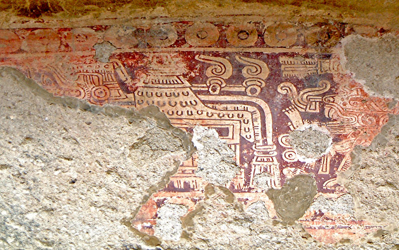 This is the remains of a mural that was above a doorway in Building 1. Aside from the Jaguar Head on the right hand side, it is hard to make out anything. There is a hint that the central figure is a feathered being of some kind. the style is considered to be in the Mixtec-Puebla style and are thought to relate to Mixtec codices that discuss their creation myths.