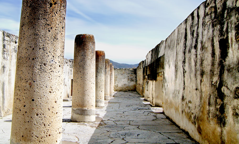 Building 5 at Mitla is also known as the Hall of Columns, however the front of the building, which is the other side of the wall on the right, is known as Building 7, or The Palace Of Pezelao.