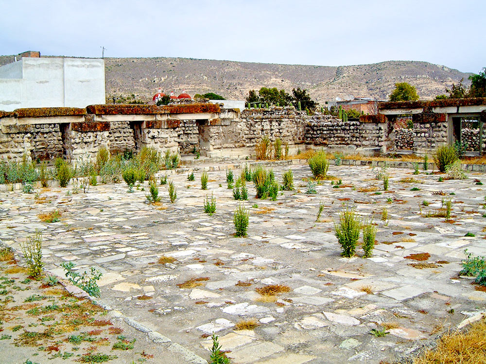 The Group De Arroyo is slightly detached from the main archaeological site, and is located 150m west from the South Group. The architecture is much the same as the other two groups. This view looks north from the northern plaza and you can see the red domes of the Spanish Church just over the wall.