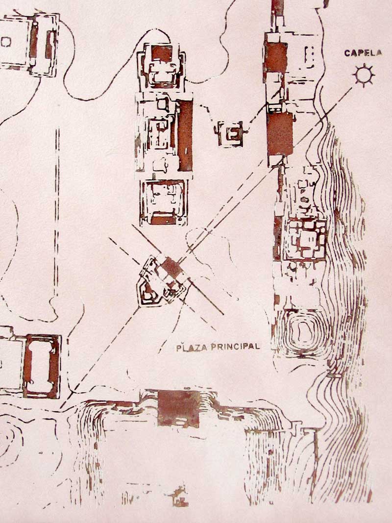 Whilst photo W0069 (above) shows the view due north up the main plaza and shows the odd shaped Building J directly in the centre, figure MA01 (left) shows a map of Monte Alban with south at the bottom and north at the top, and as you can see Building J is the only building not following a strict North/South alignment – and features a curious pentagonal shape. This clearly must be deliberate and it has been suggested that Building J may quite literally point to the answer like an arrow.