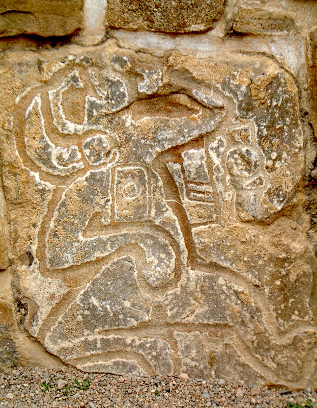 This is one of the few Danzante that actually could be mistaken for a dancer – probably drinking vodka whilst Cossack dancing. Thematically, it is the same as the free standing Danzantes, but the styling is more classically abstract rather than having a bulbous rubbery Olmec influence. © Robin Heyworth, taken on 27th December 2001