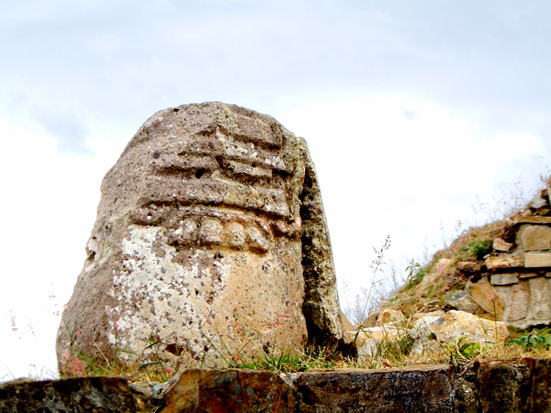 This lonely figure sits on the south-eastern corner of Edificio E looking out over nothing in particular. This heavily stylized imagery is deeply influenced by Olmec artwork and its skull-like form may allude to the building’s use.