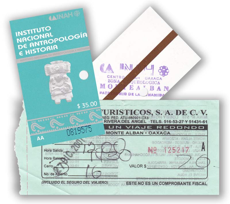 Monte Alban January 20, 2014 800 × 709 Monte Alban Entry and Bus Tickets These are copies of the bus ticket and site entry ticket from our visit on the 27th December 2001 ©Robin Heyworth