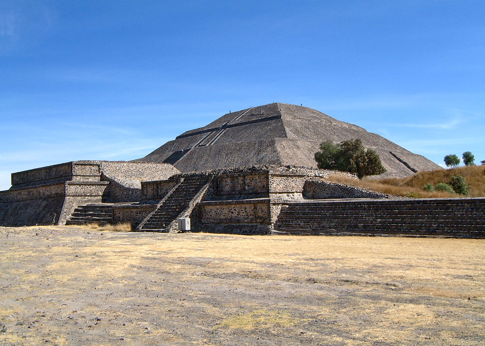 Talud-Tablero Temple on Avenue of the Dead, with the Pyramid of the Sun rising majestically behind. The Pyramid of the Sun is covered in detail in the article Pyramid of the Sun & The Orion Mystery.