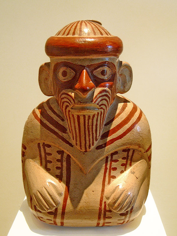 This pot is found in the Museo de Antropologia in Lima and seems to depict a wise old man, with a long beard – something that would not have been worn by a Peruvian, thus stimulating interest from ancient trans-oceanic contact theorists who believe this must be a visitor from the east – either Europe or the Middle East.