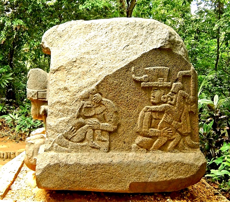 Altar 5 from La Venta features a man emerging from the front holding a child. This part of the Altar is too badly worn to identify exactly what is happening, but it is similar in theme to other monuments where the child has been identified as a “Were-Jaguar” baby. On the near side of the Altar we can see two men holding children. All the characters have down-turned mouths which are thought to be symbolic of the Olmec jaguar deity. The child we can see here looks exactly like the motif found on Monument 1 at Las Limas which is a “supernatural” known as the “Bird Monster”.