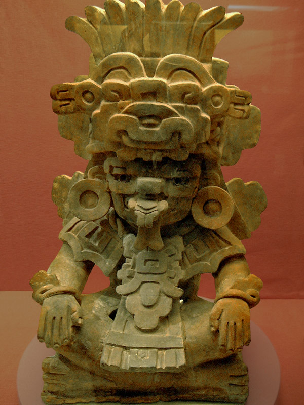This statue is of a character called Cociyo, a God of lightning and rain. He wears a headdress with plumage sprouting from the top, a jaguar-like nose and serpentine teeth. From the priests mouth protrudes a large serpent tongue and he has the “night-goggles” that symbolise the ability to see in the dark. From Central Veracruz, Classic Era, between 200BC and 900AD.