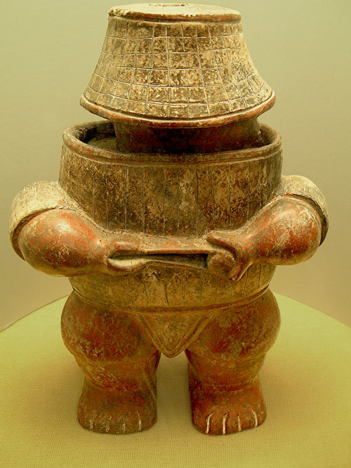 This figurine is from Western Mexico and dates from the Classic Period, 300BC to 900AD. It is very unusual as it lack any symbolism that we can decipher – is it even a man? – the feet are quite paw-like. He holds what looks like a book or folder and wearing a what looks like a barrel. The design of the hat means there is no visible face. With little discernable symbolism, the pot and its design are most likely entirely functional and designed for strength and ease of use. Whatever he holds, it probably indicates what the contents of the pot were used for.