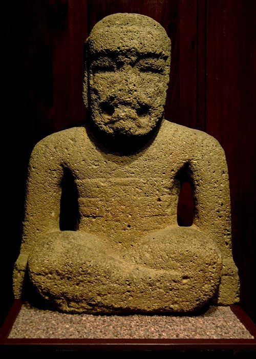 This is a rather typically styled Olmec Statue of a warrior sat in the lotus position. The head is very similar to those of the “Olmec Heads”, with rounded features and a round helmet. The downturned mouth is in keeping with a family of artistic representations known as the Were-Jaguar (read more).