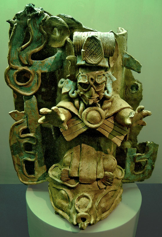 As with W0375, this is a cylindrical fire-basket and was found by Carlos Pellicer Camara within the “gruta de Tapijulapo”. The basket could have been filled with wood to heat a room, but considering the imagery of a priest standing upon the head of a mosquito, it is more likely that it was filled with incense which was burned during religious ceremonies. That said, it could well have been filled with wood and incense to keep the rooms warm and the mosquitos away at night.