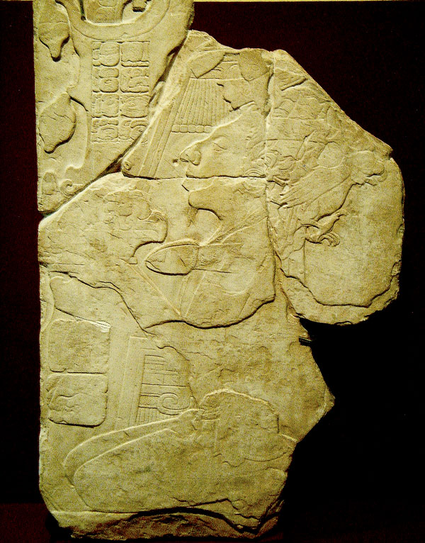 This Mayan relief is set on a limestone block and features a Lord offering a cocoa plant to the Gods. Also, clearly visible is a parrot looking in the opposite direction just above his shoulder and a rather phallic symbol protruding from his chest – it is unclear what this symbolism means. The piece dates from the Classic Era, between 600AD and 900AD.