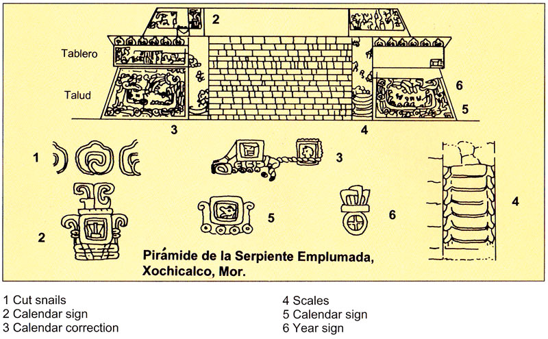 With so many influences contained within its symbolism, date glyphs, number system and architecture, the Pyramid of the Plumed Serpent is something of an enigma, which can be studied, researched, and theorised upon, but still not understood. The most likely purpose of the building appears to be either: a political statement and historical record, with Xochicalco’s conquests listed around the tablero section, along with the dates and tributes paid, with their warrior-chiefs listed on the upper tier with animals to distinguish their regiment or district, and dates to record their subjugation, alliance, victory or defeat; or, it was built to host and record the witnessing of a celestial event, with the attendees pictured around the tablero section and the great rulers of Mesoamerica listed around the upper tier, with animals used to distinguish their regional authority and dates to list their age, accession or alliance with Xochicalco.