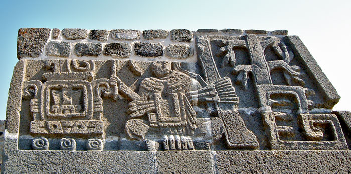 Considering the feathered serpents are the most outstanding feature on the walls, it is logical that they bear the most significance – which brings us to another theory. Interestingly, there was a Lord named Quetzalcoatl (his full name was Topiltzin Cē Ācatl Quetzalcōatl) who ruled as a demi-god in a city known as Tollan, thought to be Tula or Teotihuacan. He is thought to have been exiled in the 9th century and headed east, settling eventually at the Mayan city of Chichen Itza. The Mayan and Teotihuacano influences that can be seen in the Pyramid of the Plumed Serpent, has led to a theory that Topiltzin Ce Acatl Quetzalcoatl either came here and reigned following his departure from Tollan or was from a royal lineage that was formed here and then went to Tollan to rule – possibly as the result of a conquest. This theory suggests that the Pyramid of the Plumed Serpent was built to commemorate this royal feathered-serpent lineage and that the remainder of the carvings are indeed the political achievements, conquests, subjugates, lords and leaders belonging to this feathered-serpent family. However, an alternative theory suggests that Topiltzin Cè Ãcatl Quetzalcõatl was studied at Xochicalco and learnt the ways of the feathered-serpent from the priests here, before heading west to rule at Tollan at which point he changed his named to reflect his affinity with the god, Quetzalcoatl. This theory suggests that the figures entwined within the snakes could be the high-priests of this special religious order and therefore the Pyramid of the Plumed Serpent could be a record of a religious ceremony organised to celebrate a celestial event, including the people that were involved.