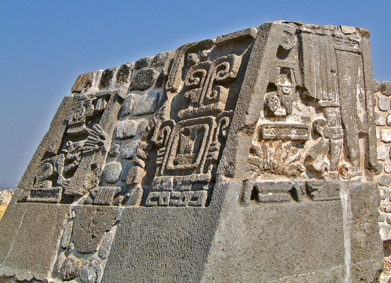 Further intrigue is added through the architectural style that was used for the Pyramid of the Plumed Serpents. The pyramidal base is built in the distinctive “Talud-Tablero” style, which is utilises two repeating elements: the “talud”, which is an inward sloping wall; and the tablero, a rectangular tier that protrudes like a table-top (see fig. W0095 & W0061P2D). Adapted styles are found across Mesoamerica and at Xochicalco they added an angled cornice to the tablero section to create their own unique style. Curiously, the Pyramid of the Plumed Serpent is the only construction at Xochicalco that uses this refined style – curiously, Buildings C and D are virtually identical in every way, apart from missing the unique tablero. Many other Mesoamerican cities feature just a single “talud-tablero” structure, which suggests the architectural style itself bears a specific meaning. The only exception is the great city of Teotihuacan, where the style was used prolifically, and this has led to the wide-spread belief that the Teotihuacano were responsible for spreading the style. The Teotihaucano are credited with creating a trade route that spanned the entire Mesoamerican subcontinent, which brought about the rapid growth of cities during the Classic Period (200AD-900AD). They are even thought to have conquered or influenced several other cities, including the Mayan cities of Tikal, Copan and Altun Ha – cities that each have a talud-tablero structure dating to somewhere between 300AD and 500AD which coincides with a Teotihuacano presence or influence in other art and pottery finds.