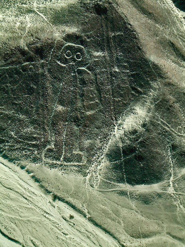 An aerial view of the so called Astronaut at the Nasca Lines. This is probably the most bizarre of all the Nasca images, for certainly depicts an alien image (but not necessarily extra terrestrial one!). As if 500m long images of local fauna wasn’t remarkable enough, the 5th century Nasca people also designed a figure of “unknown origin”.