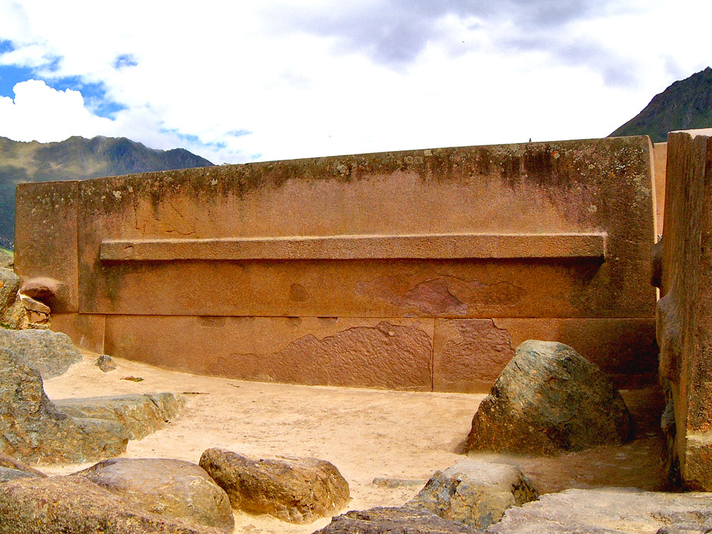 Another seemingly pointless monolith in the Temple of the Sun precinct at Ollantaytambo. This is possibly the largest of the rhyolite blocks that were dragged to the top of the Temple Hill from a neighbouring hill, across a river on the other side of the valley. There is no explanation as to why this was necessary, or why the ridge has been left on the face.