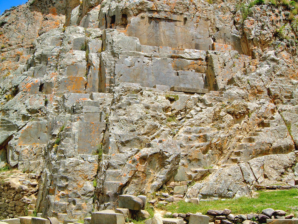 This bizarre carved wall could well have started out as a quarry, but it certainly seems to have been deliberately formed to provide some alternative. The neat stairway leading up on the right hand side and the circular protrusions higher up are certainly not a result of quarrying. Regardless of why it was created, the huge smooth surfaces are a complete mystery, for it appears the Inca cut though the andesite stone (one of the hardest rocks on earth) as though it were as soft as cheese. This inexplicable phenomenon has attracted much attention from psuedo-archaeologists and ancient alien theorists.
