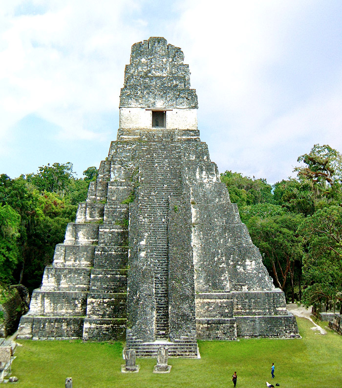 This is the view of Templo I from the top of Templo II, which sits directly opposite on the main plaza. Temple 1 is commonly known as the Temple of the Jaguar because of exquisitely carved wooden lintels found in the temple at the top of the pyramid which depict a ruler sat on a jaguar throne. The temple was built in around 732 AD by Yik’in Chan K’awiil who was the son of one of Tikal’s greatest rulers, Jasaw Chan K’awiil I, who was found buried deep within the structure (read more).